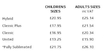 • CLASSIC PLUS – Free club badge & the ability to personalise your top within the classic plus panels. Extra logos such as sponsors & squad numbers can be added via print or embroidery.  Additional costs apply.